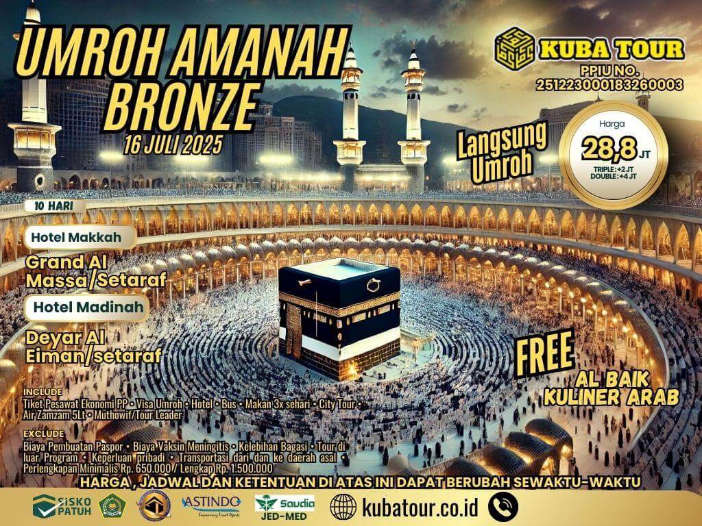 - JIKA ADA PERUBAHAN HOTEL & MASKAPAI YANG DISEBABKAN KARENA KETIDAKTERSEDIAAN / DIRUBAH SEPIHAK / FORCE MAJEUR. MAKA CALON JAMAAH TETAP MELANJUTKAN PROSES UMROHNYA TANPA PAKSAAN DAN TUNTUTAN DI KEMUDIAN HARI.